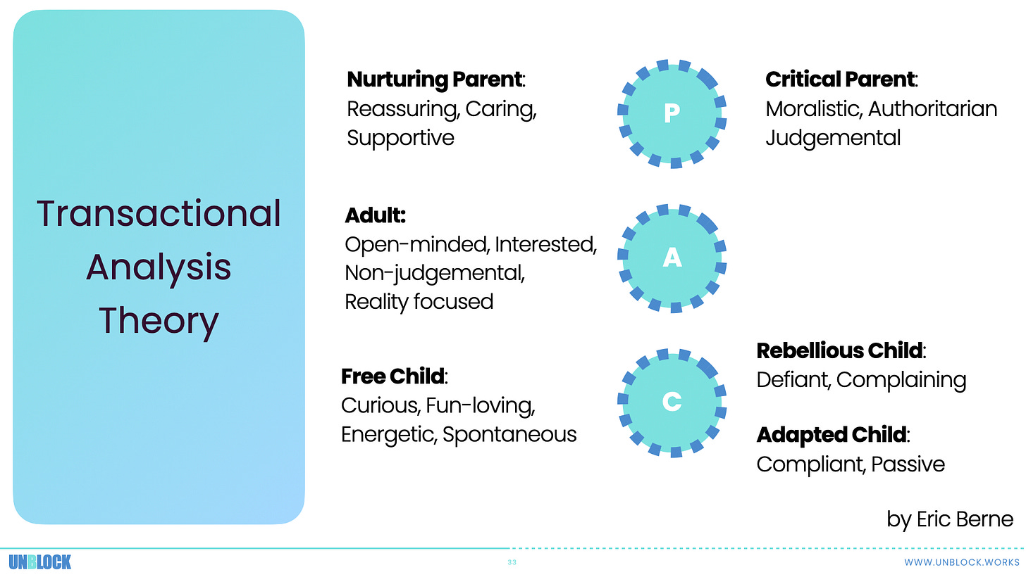 These aren’t personality flaws, they’re predictable psychological patterns. And that’s exactly what Transactional Analysis (TA) makes visible. TA says every person operates from one of three ego states at any moment: